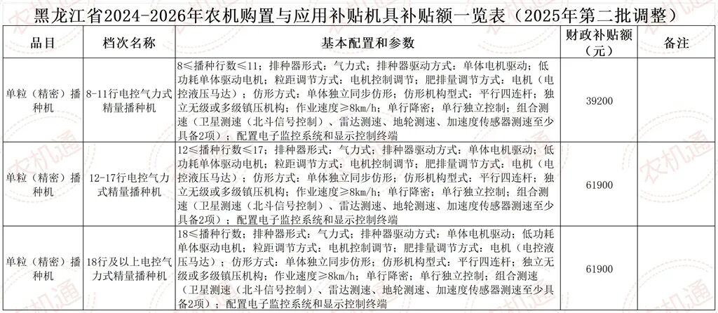 关于《黑龙江省2024—2026年农机购置与应用补贴机具补贴额一览表(2025年第二批调整)》的通告